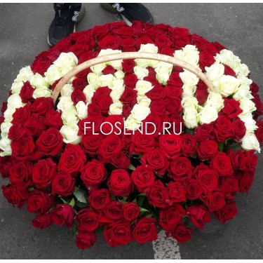 155 красных и белых роз в корзине для мамы