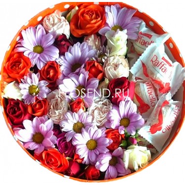 Роза кустовая малиновая, хризантемы и сладости в коробке